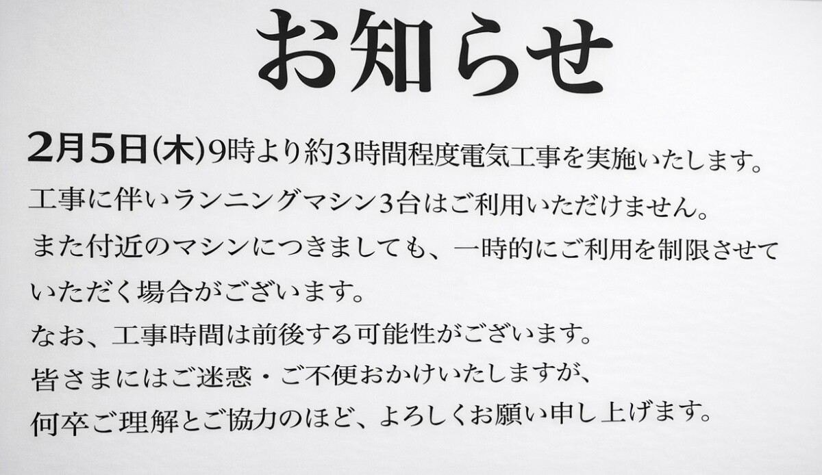 2月5日(木)9時より約3時間程度電気工事を実施いたします。